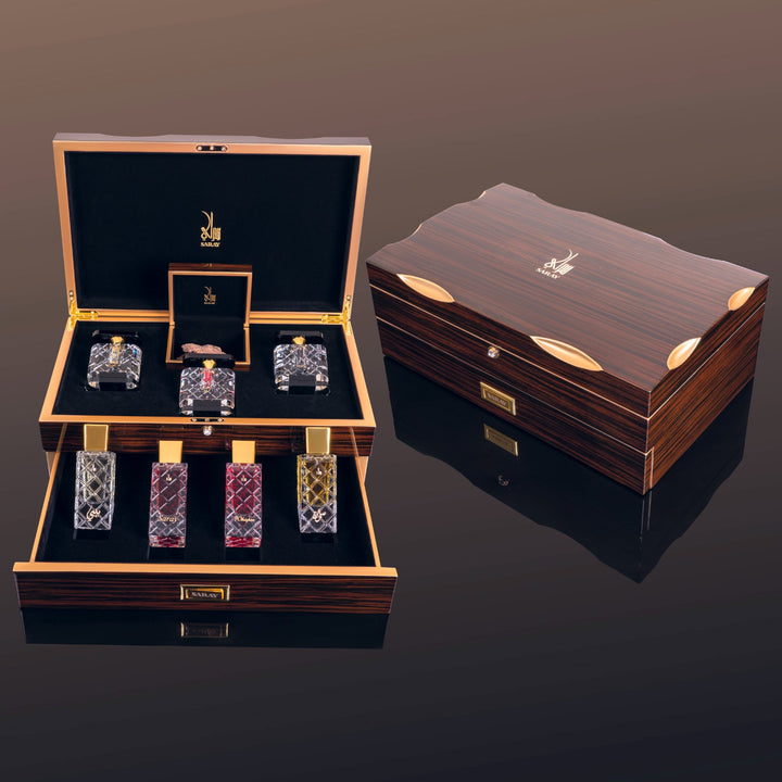 The Pearl Box by Saray is an elegant collection of oriental scents. It includes four 35ml perfumes: Baby, Adeel Al Rooh, Whisper, and Saray. Also inside: 12g (1 tola) of Clakas oud incense, and ¼ tola each of Brajeen oil, First Rose Spirit, and Laylat Omr oil.