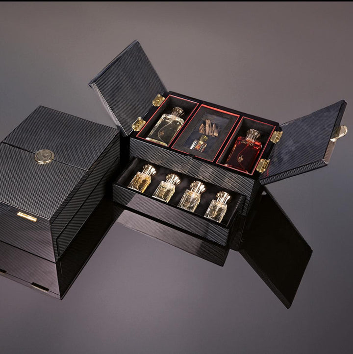 Box carbon fiber doren 2024 contains Saray perfume 50 ml, Magma perfume 50 ml, Milo EDT 15 ml, Elora EDT 15 ml, Flamenco EDT 15 ml, Malva EDT 15 ml, VIP Indian incense 12 grams, and Laylat Omar Oud oil 2 grams. This blend guarantees a rich oriental scent mixed with modern touches suitable for all occasions.